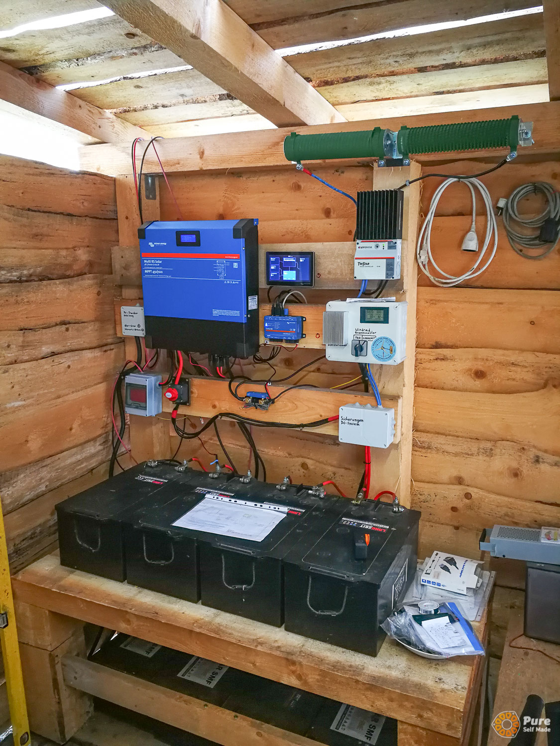 On the last day, the wind turbine was mounted on the tower next to the forest kindergarten. The wind turbine was connected to the existing, self-sufficient off-grid electrical system that powers the kindergarten. At the same time, the very small PV and storage system was also given a minor overhaul. In the long term, the system is to be expanded further.