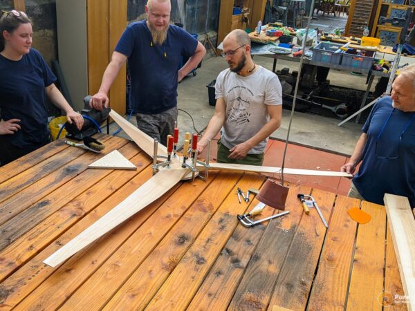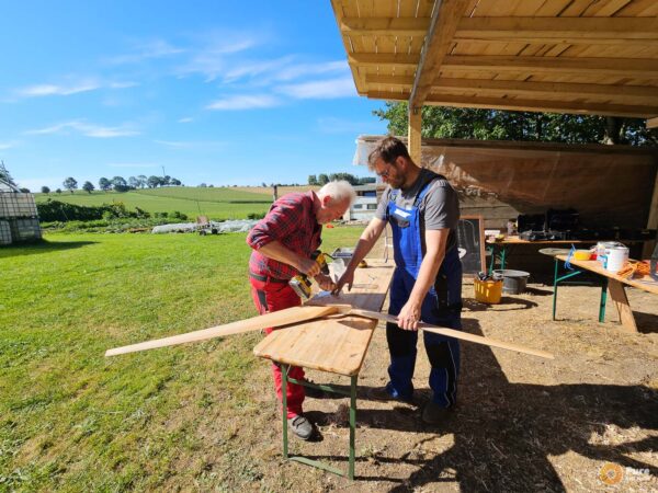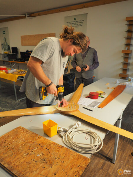 Another workshop on building the 2.2F wind turbine on our summer tour. This time, it took place in a workshop at Andreas Härting’s company, Naturholzelemente. We had plenty of space at the location for a successful project with a motivated group.