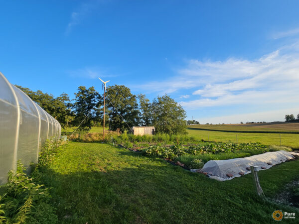 In the third workshop of the summer tour, our small group built a 2.2F wind turbine for a farm that operates on a remote property based on the community-supported agriculture (CSA) model. In addition to the wind turbine, we set up a new self-sufficient energy system consisting of solar panels, a battery storage unit, an inverter, and more. We used the existing batteries as well as some of the farm’s existing components.