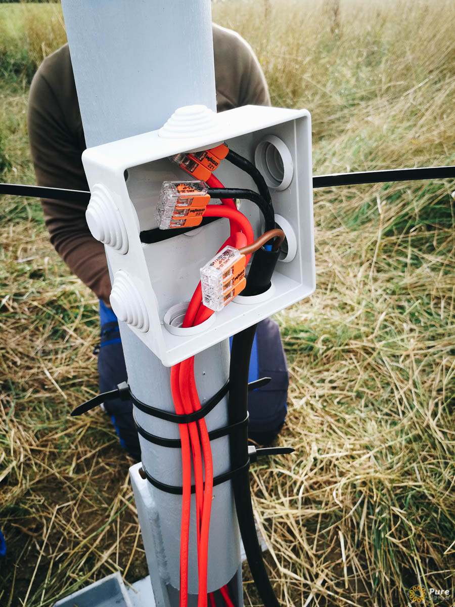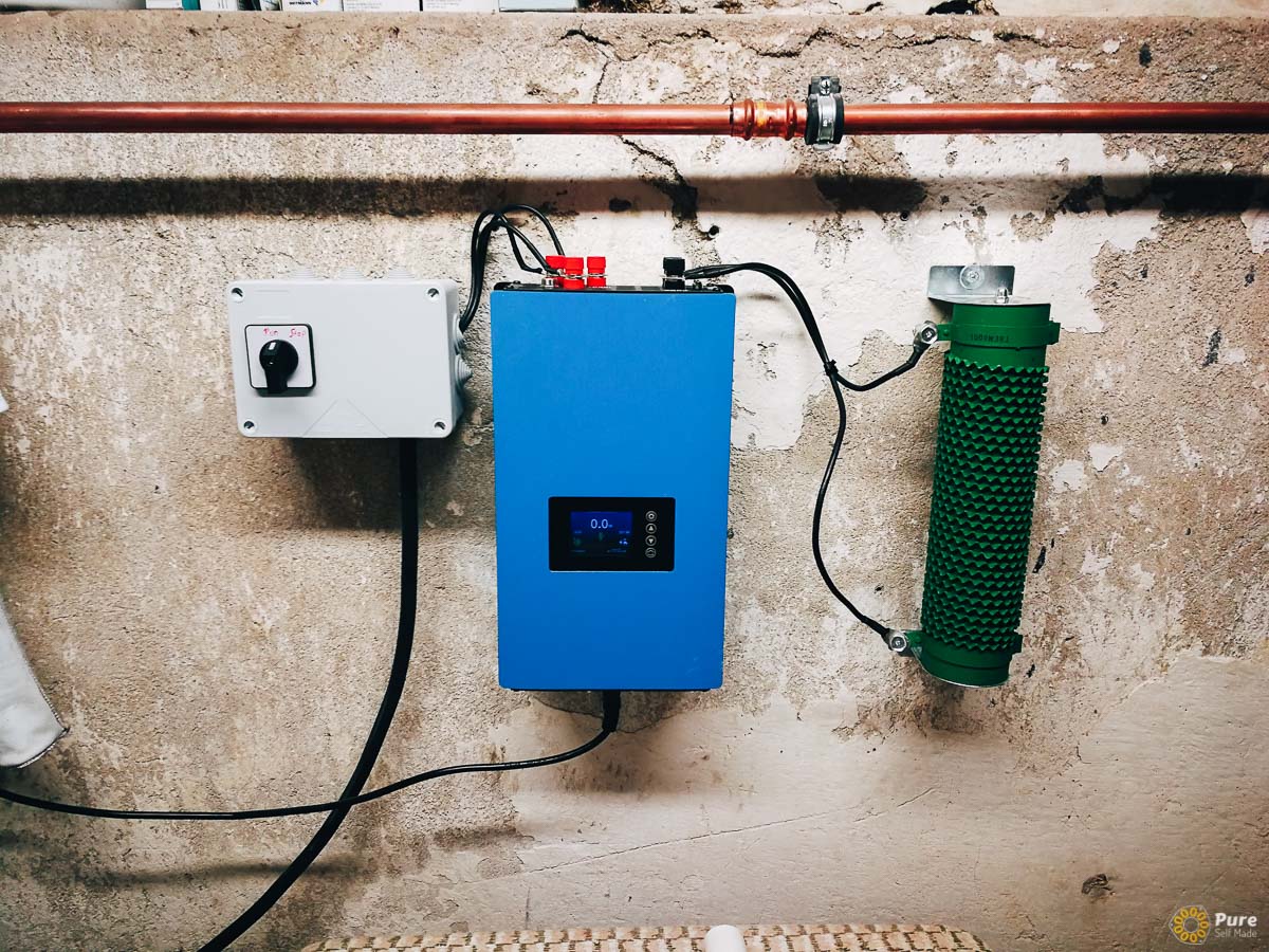 Am Ende des Kurses war die Windkraftanlage vor Ort installiert, mit einem langen Kabel, das zum Haus führte. Wir haben den Wechselrichter und die Steuerung für die Anlage im Keller untergebracht, damit sie leicht zugänglich sind. Die Energie wird in das Hausnetz eingespeist und lädt auch den bereits vorhanden Batteriespeicher.