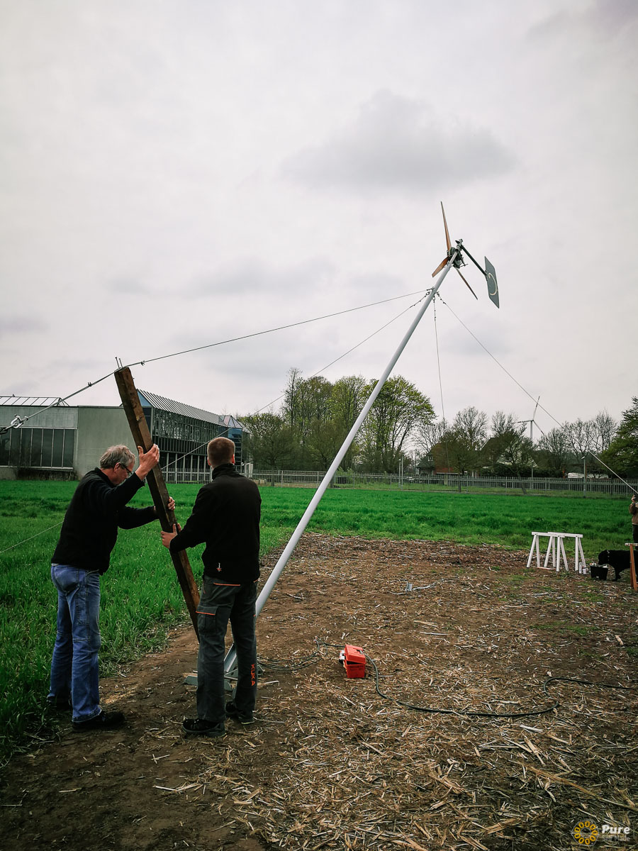 Das Windrad wurde wie üblich vollständig vor Ort gebaut. Während dieses Kurses haben wir auch einen Turm installiert. Da der Turm höher als üblich war, verwendeten wir einige größere, im Boden vergrabene Anker.